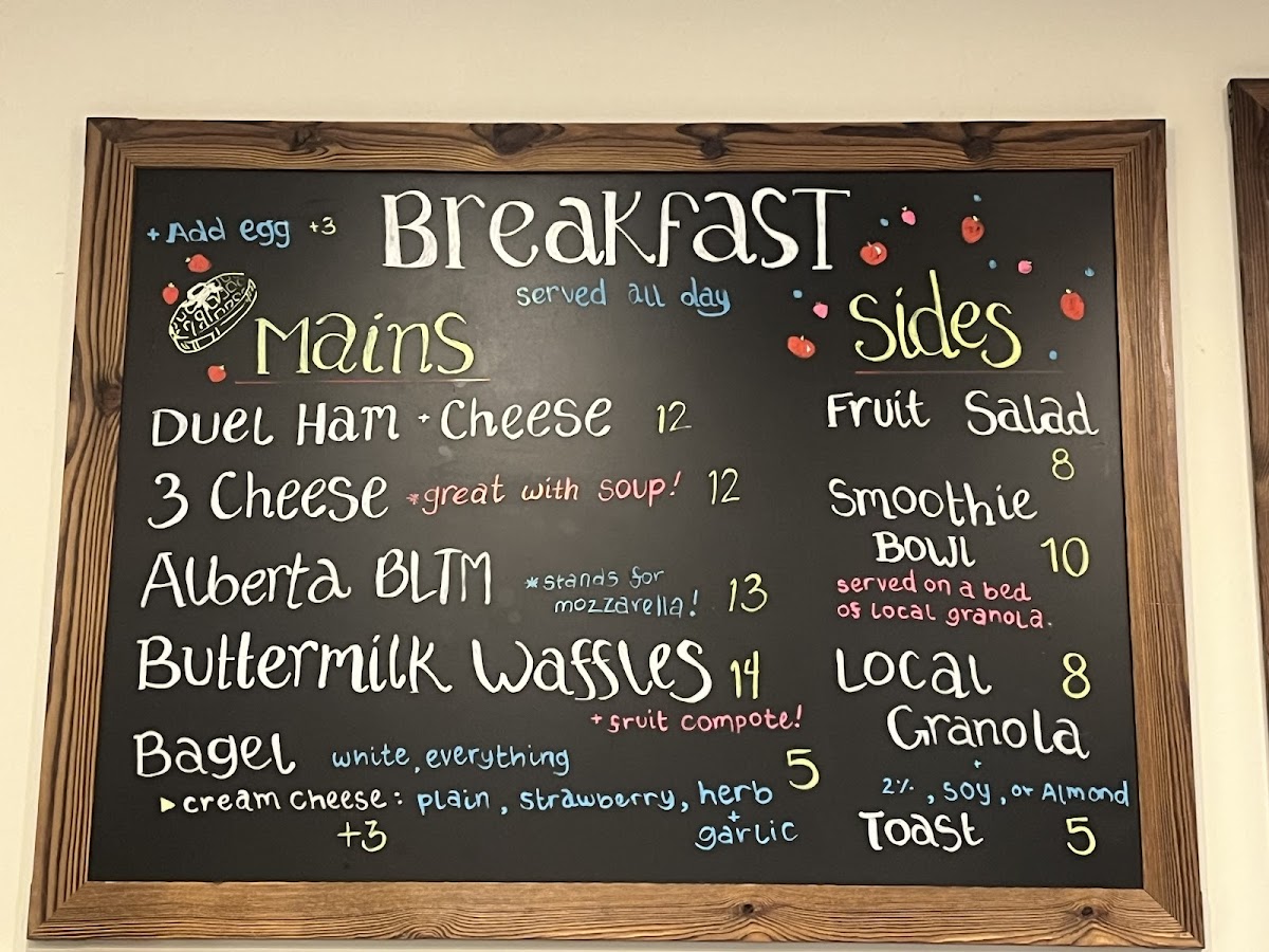 Highlighted on the menu are mouthwatering mains like the Alberta BLTM for CA$13.00, the cheesy 3 Cheese option for CA$12.00, and the indulgent Buttermilk Waffles at CA$14.00. With sides like fruit salad priced at CA$8.00, there’s something for everyone.
